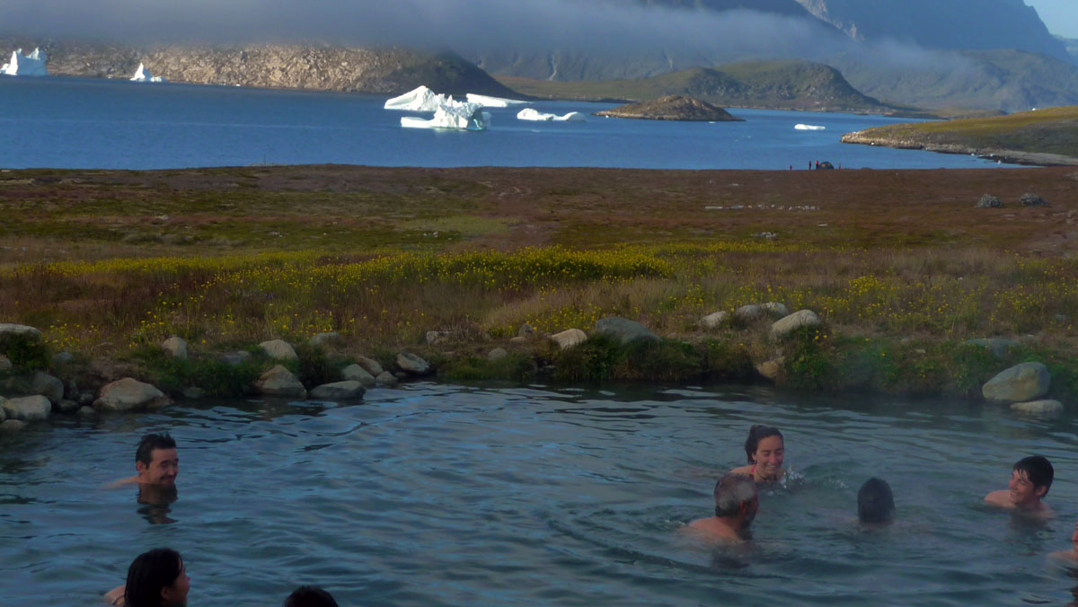 Dag 3. Vi gör en båttur till de varma källorna vi Uunartoq. Här kan du ta ett bad i 38-gradigt vatten och se isbergen flyta förbi. Turen är på ca 4½ timme totalt fördelat på 1½ båttur till källorna, 1½ timmes besök och sedan tilbaka med båten. Vi åker normalt med snabba targa där du sitter bekvämt innomhus.